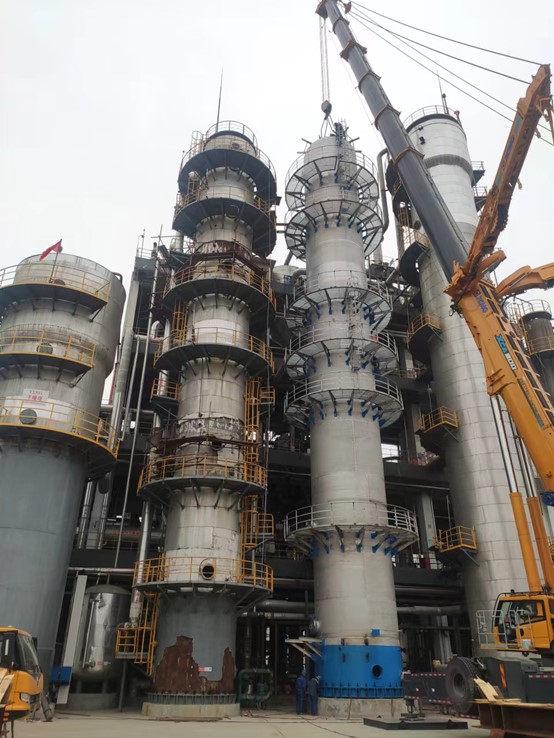 恒通化工項(xiàng)目雙氧水裝置氫化塔氧化塔更換工程氧化塔一次吊裝就位成功