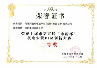 2018年12月,上海市第五屆“申新杯”BIM機電安裝BIM創(chuàng)新大賽結果出爐,迪爾集團有限公司參賽作品《菏澤潤鑫熱電聯(lián)產項目鍋爐安裝BIM技術應用》斬獲BIM創(chuàng)新大賽二等獎。